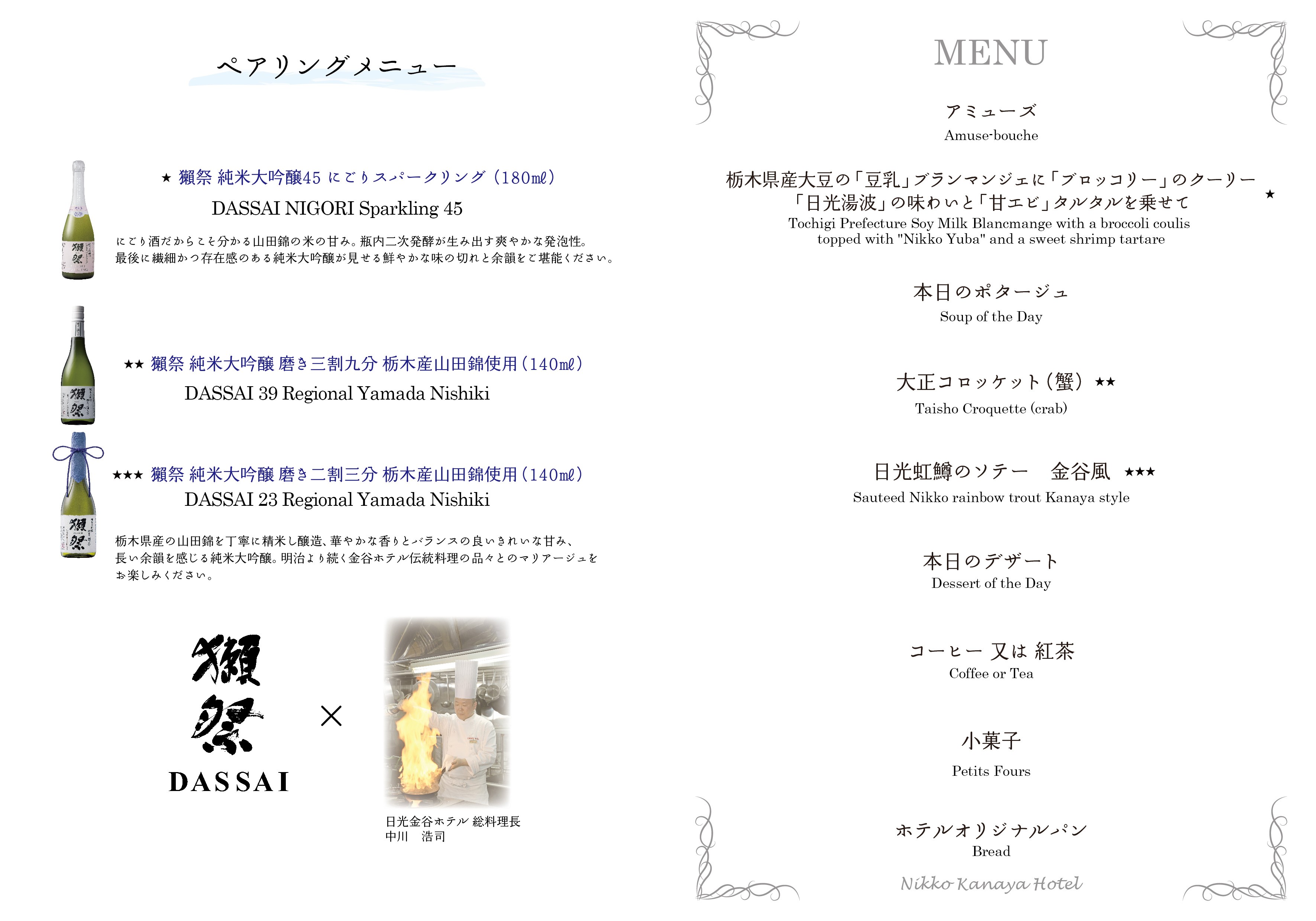 この度、栃木県限定販売の「獺祭 純米大吟醸 磨き三割九分 栃木産山田錦使用」および「獺祭 純米大吟醸 磨き二割三分 栃木産山田錦使用」を用いたペアリングメニューをご用意し、金谷ホテル伝統のクラシックな味わいを獺祭特別コースとともに堪能いただける特別プランを販売いたしております。